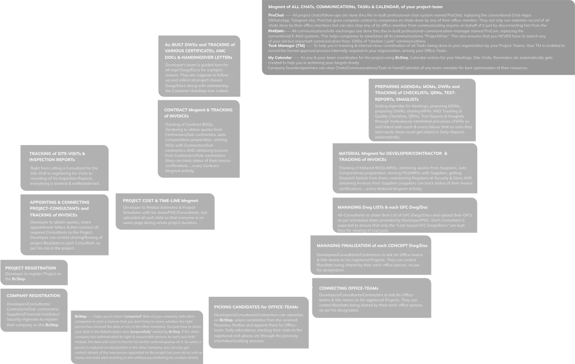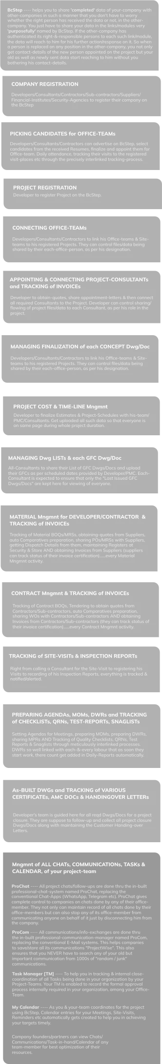 Connecting ALL Project-teams AND Step Wise Flow-of-Information, to Monitor & Manage all your Project Activities, thru the Under-Patent unique construction-management ERP solution named ---- BcStep